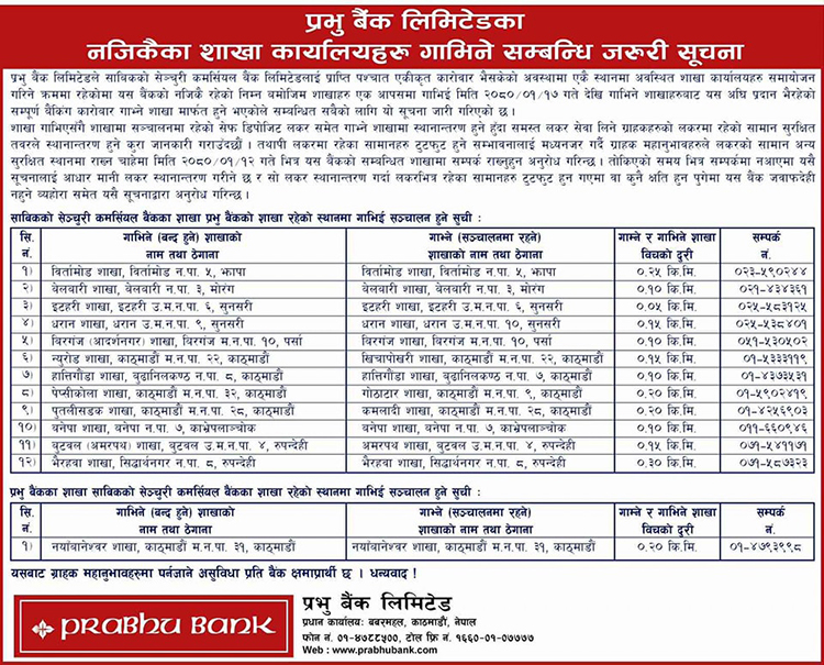 त्यस्तै, साविकको प्रभु बैंककाे नयाँ बानेश्वर शाखा बन्द गरी सोही ठाउँमा रहेको सेञ्चुरी कमर्शिय बैंकको शाखा भएको ठाउँबाट सेवा दिने भएको हो ।