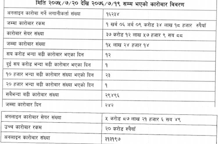 एक वर्षको अवधिमा अनलाइनबाट कूल १६ अर्ब ५४ करोड रुपैयाँको सेयर कारोबार भएको छ । यसैगरी अनलाइन कारोबार सेयर संख्या ५ करोड ८७ लाख रहेको छ भने अनलाइन कारोबार संख्या ३ लाख १३ हजार रहेको छ ।