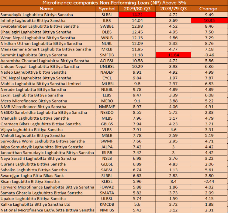 यस्तै, इन्फिनिटी लघुवित्तको खराब कर्जा १४.०४ प्रतिश, स्वाबलम्बन लघुवित्तको १२.९८ प्रतिशत, धौलागिरिको १२.४५ प्रतिशत, वीन नेपाल लघुवित्तको १२.१५ प्रतिशत, निर्धन उत्थानको १२.०९, मनकामना स्मार्टको ११.९५ प्रतिशत, समिट लघुवित्तको ११.१८ प्रतिश, आरम्भ चौतारीको १०.५८ प्रतिशत र युनिक नेपालको १०.२९ प्रतिशत रहेको छ ।