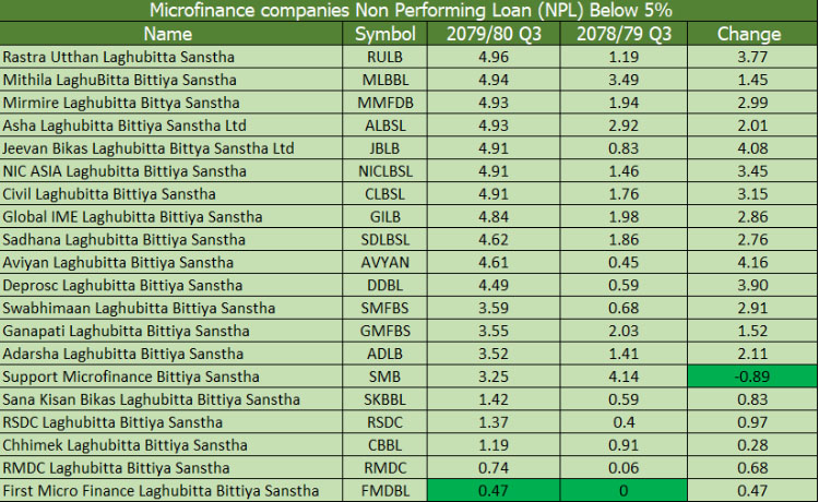 तेस्रो त्रैमाससम्म फर्स्ट माइक्रोफाइनान्सको खराब कर्जा सबैभन्दा कम ०.४७ प्रतिशत रहेको छ । यसैगरी, आरएमडीसी लघुवित्तको ०.७४ प्रतिशत, छिमेक लघुवित्तको १.१९ प्रतिशत, आरएसडीसीको १.३७ प्रतिशत र साना किसानको १.४२ प्रतिशत रहेको छ ।