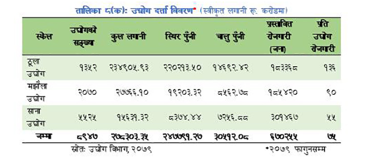 २०७९ फागुनसम्म कुल ८ हजार ९४७ उद्योग दर्ता भएका छन्। तीमध्ये ठूला, मझौला र साना उद्योगको हिस्सा क्रमशः १५.१ प्रतिशत, २३.१ प्रतिशत र ६१.८ प्रतिशत रहेको सर्वेक्षणमा उल्लेख छ । फागुनसम्मको कुल प्रस्तावित लगानी २७ खर्ब ८३ अर्ब रुपैयाँ छ ।