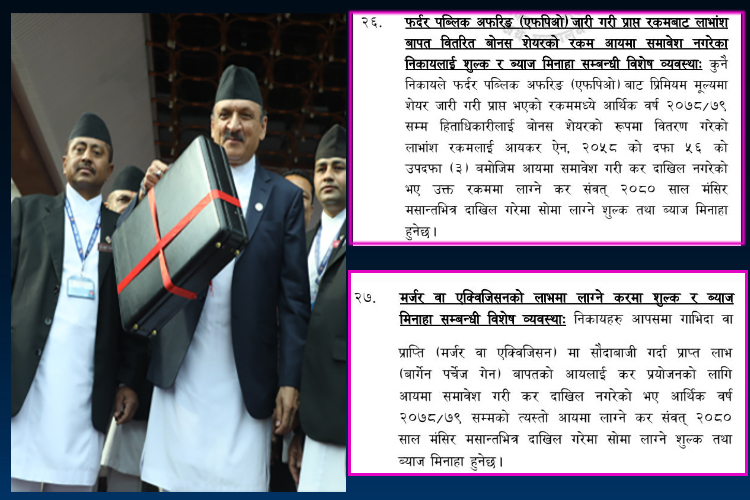 सरकारले एफपीओ र मर्जरबाट प्राप्त लाभको कर मंसिरसम्म तिर्न भनेको छ । यद्यपि, यस्तो शुल्कमा लाग्ने ब्याज भने मिनाहा गरेको छ । ‘कुनै निकायले एफपीओबाट प्रिमियम मूल्यमा सेयर जारी गरी प्राप्त भएको रकम मध्ये आर्थिक वर्ष २०७८/७९सम्म हिताधिकारीलाई बोनस शेयरको रुपमा वितरण गरेको लाभांश रकमलाई आयकर ऐन २०५८ को दफा ५६ को उपदफा (३) बमोजिम आयकरमा समावेश गरी कर दाखिला नगरेको भए उक्त रकममा लाग्नेकर २०८० मंसिरभित्र दाखिल गरेमा सोमा लाग्ने शुल्क तथा ब्याज मिनाहा हुनेछ,’ आर्थिक विधेयकमा भनिएको छ ।