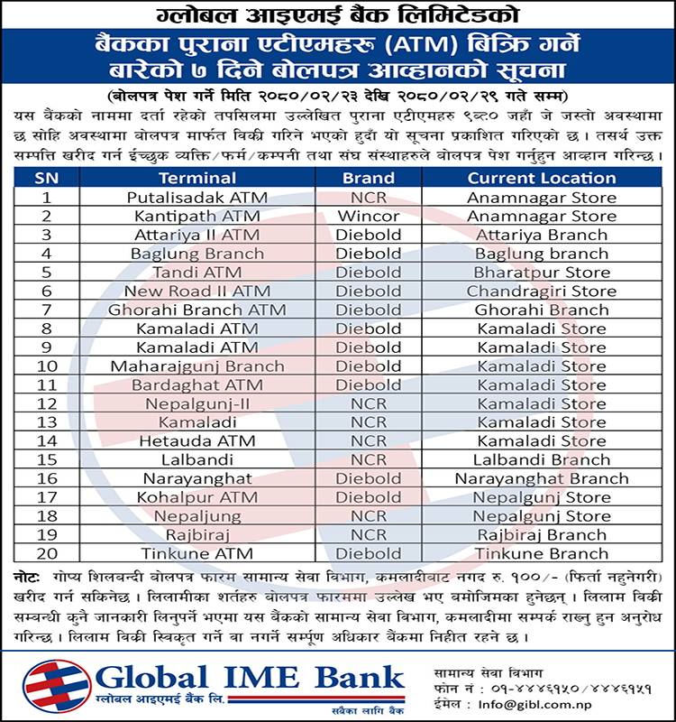 काठमाडौं । ग्लाबेल आइएमई बैंकले २० वटा पुराना एटीएम मेसिन बिक्री गर्ने भएको छ । बैंकले विभिन्न शाखा र गोदाममा रहेका २० वटा एटीएम मेसिन बेच्न लागेको हो ।