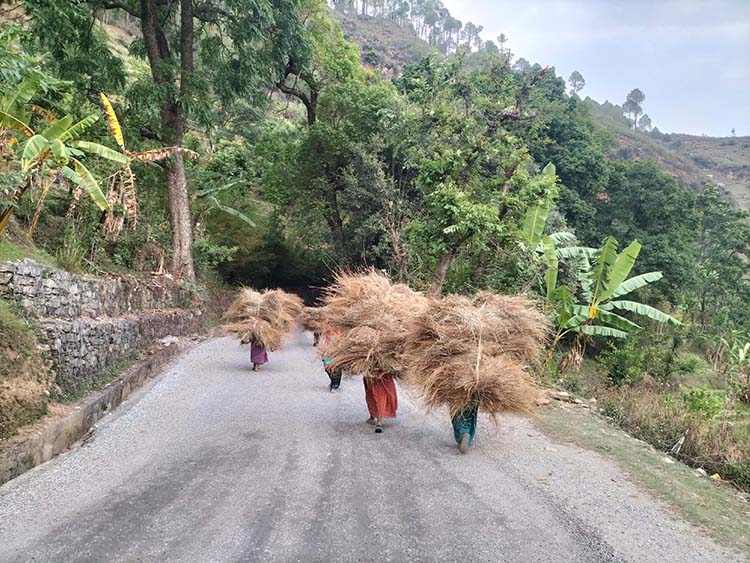बैतडीको दोगडाकेदारका महिला खरको भाडी बोकेर घरतिर जाँदै । असोज/कात्तिकमा काटेर सुरक्षित राखेको खर गाईबस्तुका लागि हुन् । तस्वीर : विनोद सिंह विष्ट