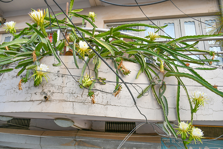 घोराही-१५ न्युरोडस्थित एक घरको बार्दलीमा फुलेको ड्रागन फ्रुटको फूल । यसको फूल रातिमा मात्रै फुल्छ दिउँसो हुँदै गर्दा ओलाउने गर्दछ । तस्वीर : कुलदीप न्यौपाने