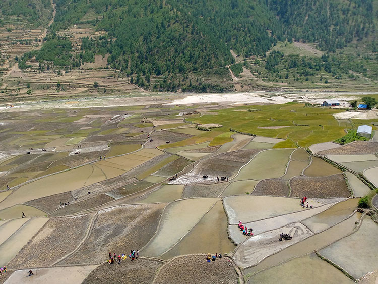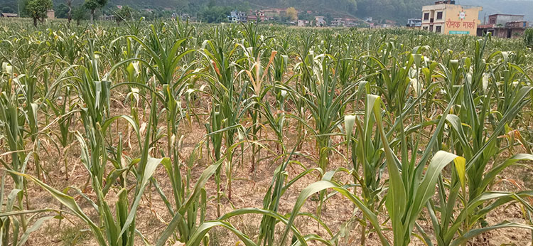 पानी नपरेपछि पाल्पा रामपुर नगरपालिका-५ स्थित बेझाड खेतमा सुक्दै गरेको मकैबाली । तस्वीर : सुशीला रेग्मी