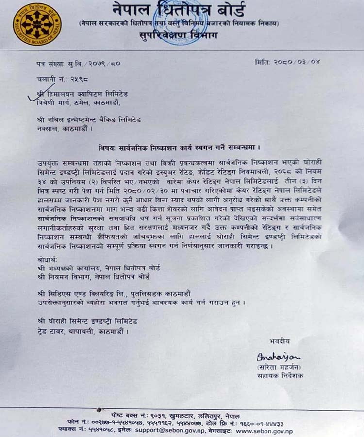 यसरी ठूलो मात्रमा फर्जी आवेदन परेपछि लगानीकर्ताको हित र सुरक्षालाई मध्येनजर गर्दै हाललाई उक्त कम्पनीको सेयर निष्कासन सम्बन्धी सम्पूर्ण काम रोक्ने निर्णय भएको बोर्डले जनाएको छ ।