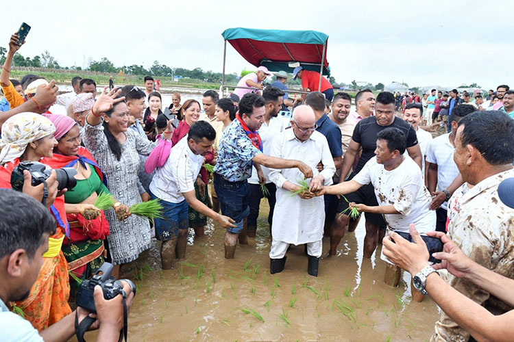 २० औँ राष्ट्रिय धान दिवस तथा रोपाइँ महोत्सवको अवसरमा घोराही १७ डवरीस्थित गुठी खेतमा धान रोप्दै जनप्रतिनिधि तथा कर्मचारी ।