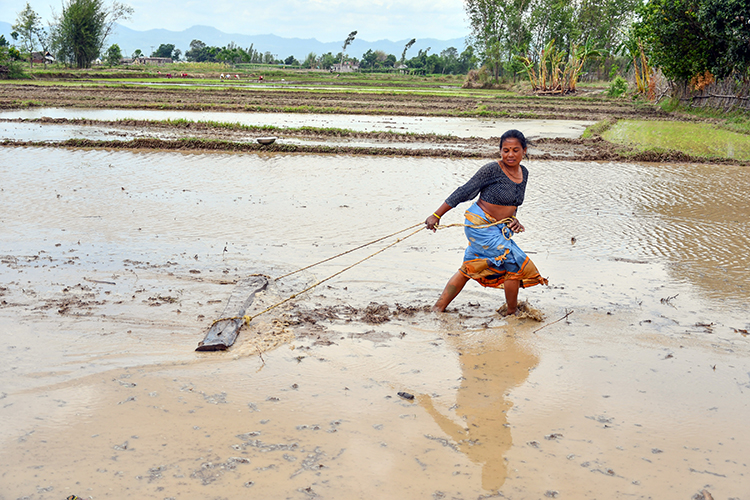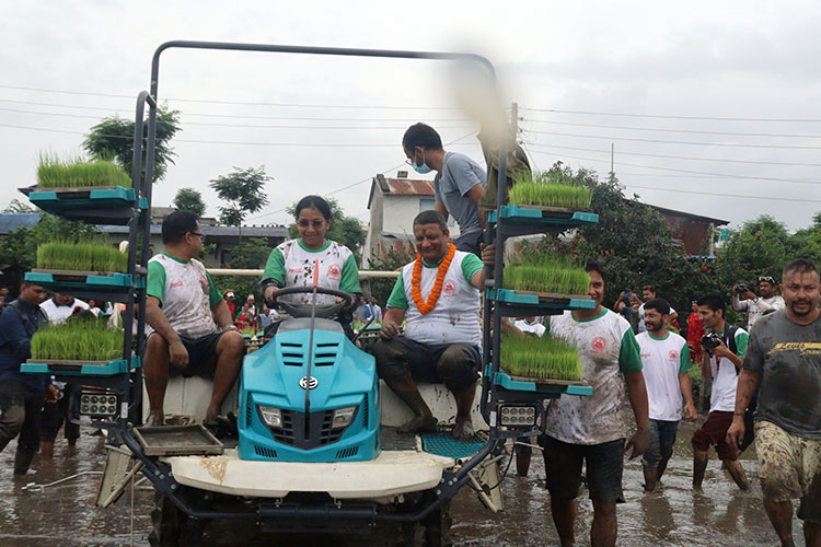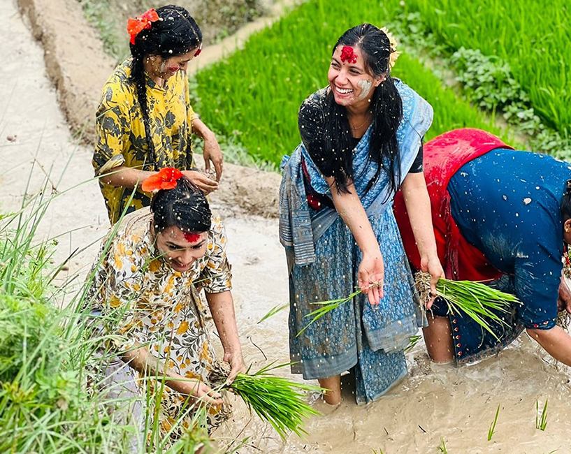 धान दिवसको अवसरमा रोपाइँमा सहभागी हुँदै रास्वपाकी सांसद सोविता गौतम लगायत ।