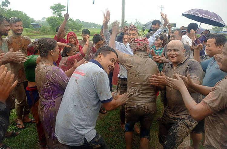 शुक्रबार सुनसरीको इनरुवामा धान रोपेपछि नाचगान गर्दै स्थनाीय ।