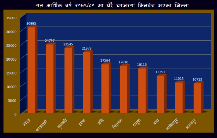 गत वर्षमा सबैभन्दा धेरै घरजग्गा किनबेच हुनेमा मोरङ पहिलो नम्बरमा छ । यस जिल्लाको रङगेली, विराटनगर र बेलवारी मालपोत कार्यालयबाट ३० हजार ९९५ घरजग्गा किनबेच भएको छ ।