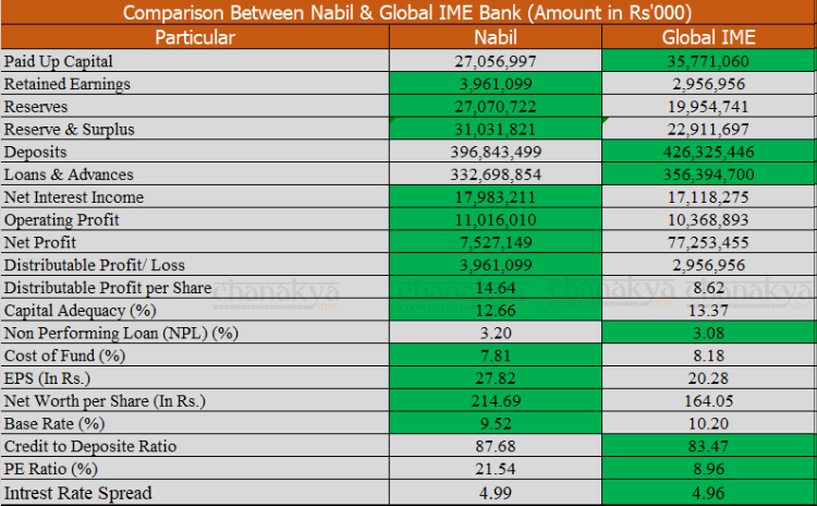 सेयर लगानीकर्ताहरूले धेरै चासोका साथ हेर्ने मुख्य सूचकहरू, खुद नाफा, वितरण योग्य नाफा, प्रतिसेयर आम्दानी, जगेडा कोष जस्ता सूचकमा नबिल अगाडि रहेको छ भने चुक्ता पूँजी, निक्षेप संकलन, कर्जा, लगानी, शाखा लगायत सूचकमा ग्लोबल अघि रहेको छ ।