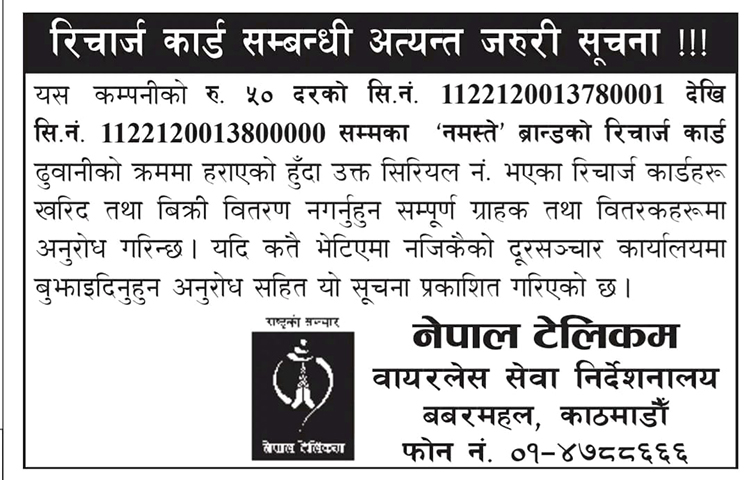 साथै, टेलिकमले ती रिचार्ज कार्ड फेला पारेमा नजिकको दूरसञ्चार कार्यालयमा बुझाइदिन समेत आग्रह गरेको छ ।