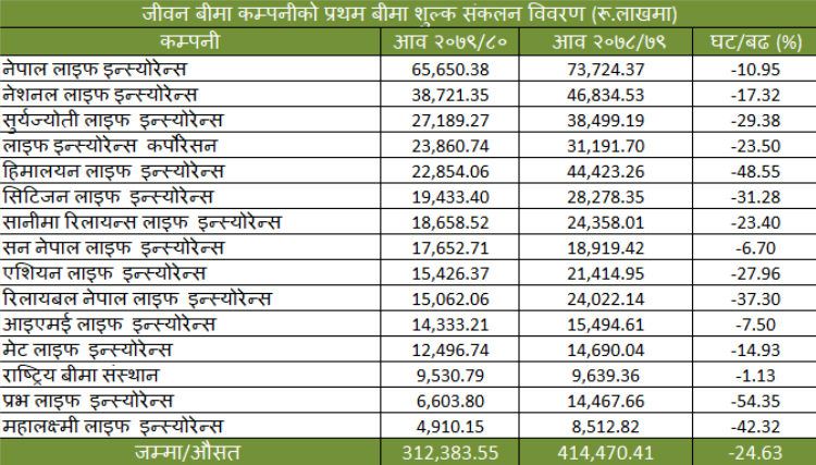 रिलायबल नेपालको ३७, सिटिजनको ३१, सूर्यज्योती २९, सानिमा रिलायन्स २३, एशियन २७, मेट १४, लाइफ इन्स्योरेन्स कर्पोरेसन १४, नेपाल लाइफ १० र नेशनल लाइफको १७ प्रतिशतले प्रथम बीमा शुल्क घटेको छ । सबैभन्दा कम राष्ट्रिय बीमा संस्थानको प्रथम बीमा शुल्कमा १.१३ प्रतिशतले न्यून गिरावट आएको छ ।