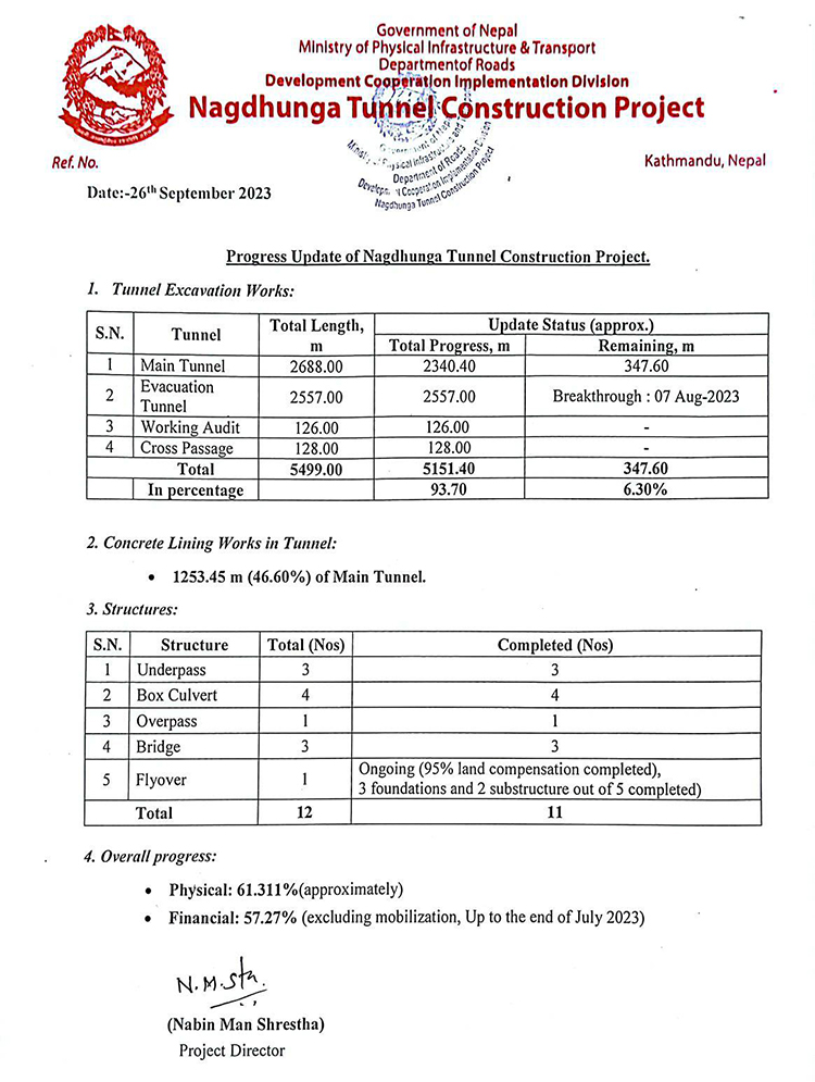 नागढुंगा सुरुङमार्ग आयोजनाका अनुसार कुल २६८८ मिटर मुख्य सुरुङमध्ये हालसम्म २३४०.४० मिटर सनिसकिएको छ । अब ३४७.६० मिटर मात्र सुरुङ खन्न बाँकी छ । कात्तिकभित्रै सुरुङमार्गको ब्रेक थ्रु हुने आयोजनाले बताएको छ ।