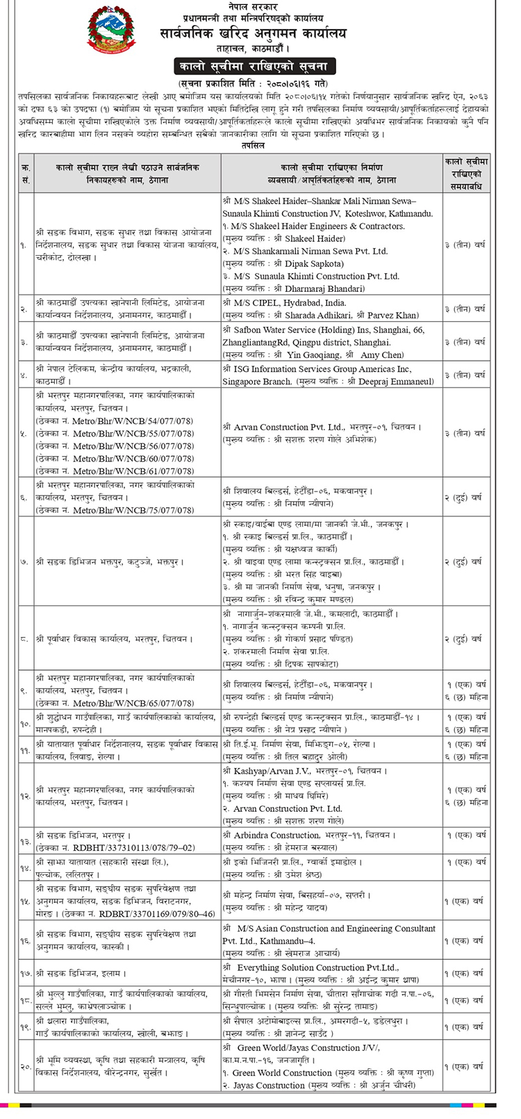 कार्यालयका अनुसार एम/एस सकिल हैदर इन्जिनियर्स एण्ड कन्सट्रक्सन, एमरएस शंकरमाली निर्माण सेवा, एम/एस सुनौला खिम्ती कन्सट्रक्सन, एम/एस सिपल हैदरावाद, साफबोन वाटर सर्भिस साङघाइ, आईएसजी इन्फरमेसन सर्भिस ग्रुप र आर्भण अन्सट्रक्सन ३ वर्षका लागि कालोसूचीमा परेका छन् । चितवन रहेका छन् ।