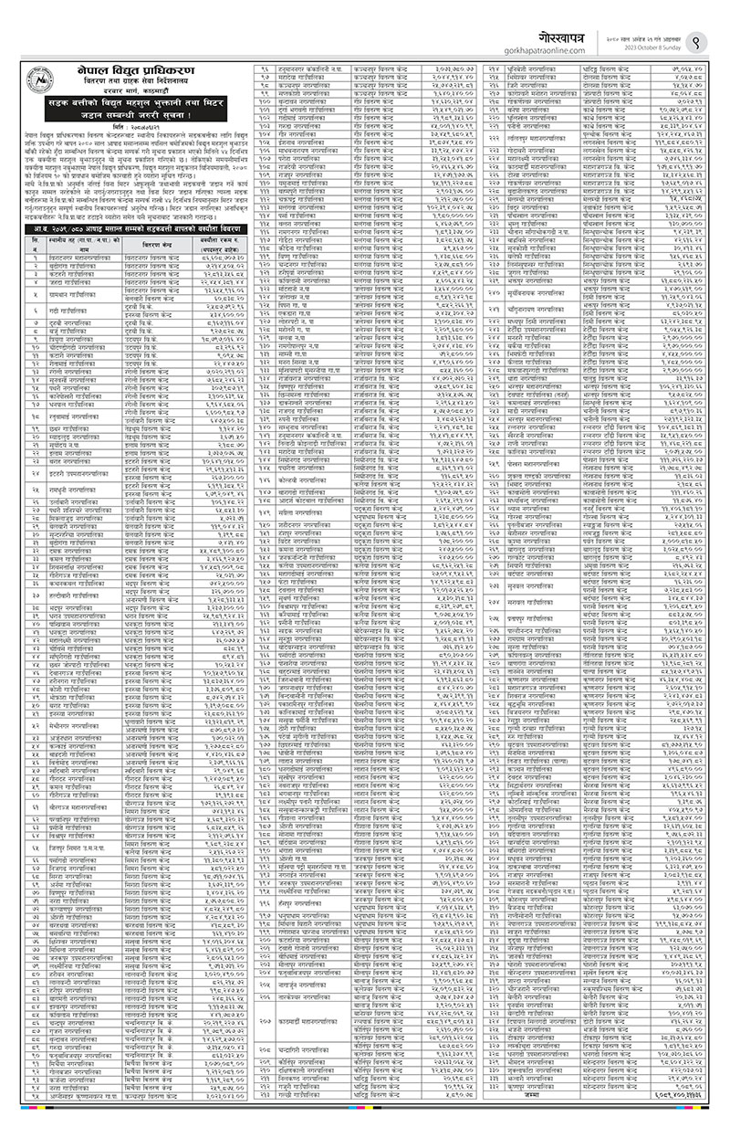 काठमाडौं । काठमाडौं महानगपालिका सहित ३३२ स्थानीय तहले बिजुलीको महशुल भुक्तानी नगरेको पाइएको छ । नेपाल विद्युत् प्राधिकरणले आइतबार एक सूचना प्रकाशन गर्दै देशभरका ३३२ स्थानीय तहलाई ४५ दिनभित्र बाँकी विद्युत् महशुल बुझाउन ताकेता गरेको हो ।