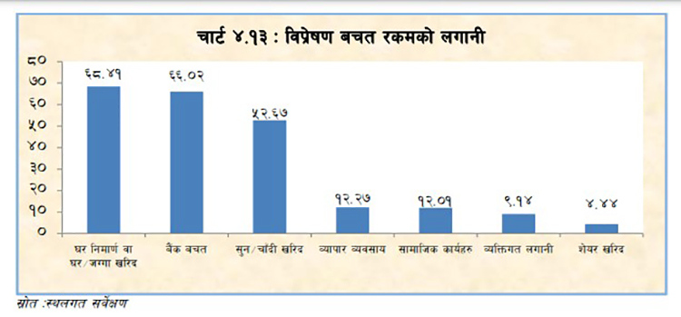 काठमाडौं । वैदेशिक रोजगारीमा गएका नेपालीले पठाएको रेमिट्यान्सको अधिकांश रकम घरजग्गामा लगानी हुने गरेको देखिएको छ । नेपाल राष्ट बैंकले गरेको एक अध्ययनले रेमिट्यान्सको दुईतिहाई बढी अर्थात् ६८.४१ हिस्सा घर निर्माण तथा जग्गा खरिदमा खर्च हुने गरेको देखाएको हो ।