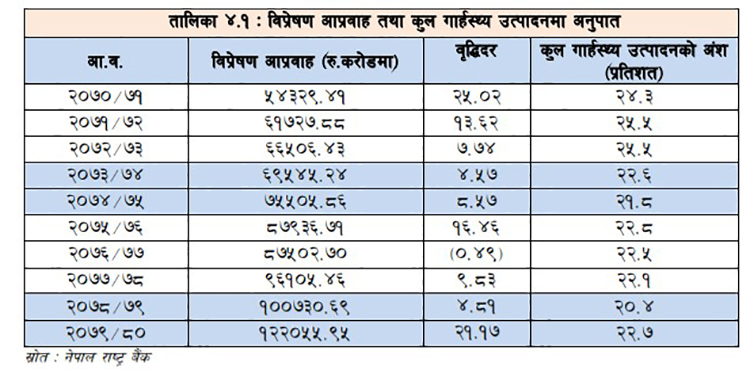 गत आर्थिक वर्षमा २१.१७ प्रतिशतले वृद्धि भएर १२ खर्ब २० अर्ब रुपैयाँ रेमिट्यान्स भित्रिएर रेकर्ड बनाएको थियो । यो अवधिमा कुल जीडीपीको २२.७ प्रतिशत हिस्सा रेमिट्यान्सको रहेको राष्ट्र बैंकको तथ्यांकले देखाउँछ ।