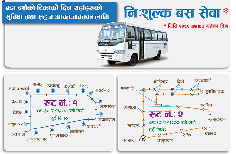 काठमाडौं । नेपाल प्रहरीले आज विजया दशमी अर्थात् टीकाका दिन काठमाडौँ उपत्यकामा निःशुल्क बस सेवा सञ्चालन गर्ने भएको छ ।