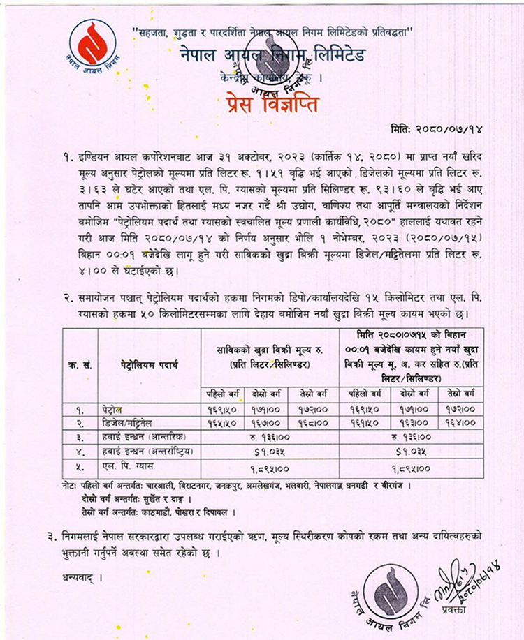 निगमले पेट्रोल र एलपी ग्यासको मूल्य भने यथावत नै राखेको छ । पेट्रोलको मूल्य प्रतिलिटर १.५१ रुपैयाँ र खाना पकाउने एलपी ग्यास प्रतिसिलिण्डर ९३.६० रुपैयाँ बढेर आए पनि चाडपर्वको बेला उपभोक्ताको हितलाई ध्यानमा राख्दै यथावत राखिएको नियगमको भनाइ छ । यसअघि निगमले असोज २८ गते पेट्रोलको भाउ लिटरमै ११ रुपैयाँ घटाएको थियो ।