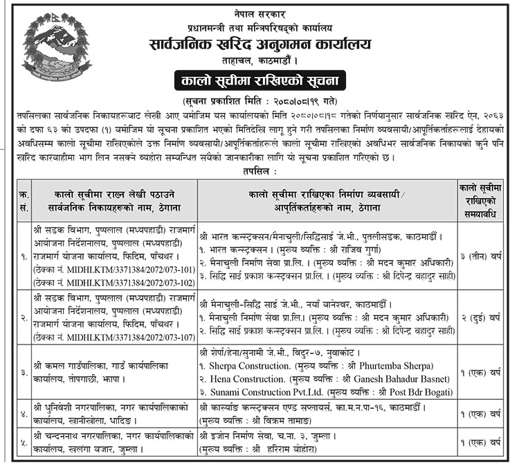 कार्यालयका अनुसार मध्यपहाडी राजमार्गको सिफारिसमा पाँचथरमा निर्माणाधिन दुई वटा सडक खण्डको काम अलपत्र पार्ने भारत कन्स्ट्रक्सन, मैनाचुली निर्माण सेवा र सिद्धि साई प्रकाश कन्स्ट्रक्सनलाई ३ वर्षका लागि कालोसूचीमा राखिएको छ ।