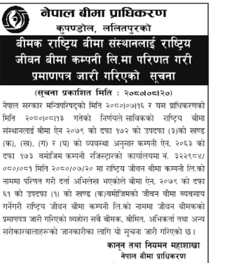 नेपाल बीमा प्राधिकरणले कम्पनीलाई पब्लिकमा परिवर्तन भएको प्रमाणपत्र दिएको छ । पब्लिकमा रुपान्तरण भएसँगै अब कम्पनीले सर्वासाधरणका लागि सेयर जारी गर्नुपर्नेछ ।