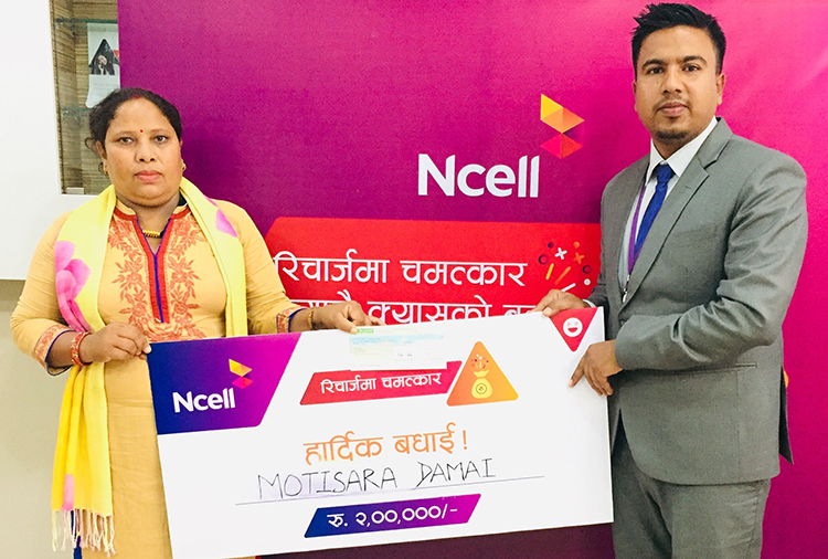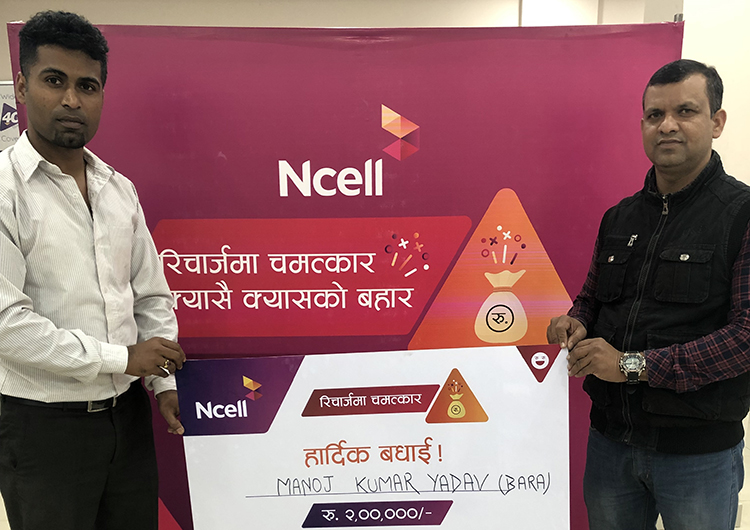 एनसेलले ‘रिचार्जमा चमत्कार’ अफर अन्तर्गत पहिलो हप्ताका पाँच जना भाग्यशालीमध्येका दुई ग्राहकलाई बिहीबार २ लाख रुपैयाँ नगद पुरस्कार वितरण गरेको छ ।