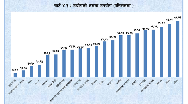 विशेषगरी ड्राई सिरप, बिजुलीका तार तथा केबुल, साबुन, चामल, गहुँको पिठो, तोरीको तेल, फलामको छड/पत्ति तथा सामानहरू र औषधीजन्य उत्पादन गर्ने उद्योगको क्षमता उपयोगमा कमी आएकाले गत वर्षको सोही अवधिको तुलनामा समग्र उद्योगको औसत क्षमता उपयोगमा केही ह्रास आएको छ । गत वर्ष सबैभन्दा बढी मदिराजन्य उद्योगले ८५.७६ प्रतिशत र सबैभन्दा कम ड्राइ सिरप औषधी उत्पादन गर्ने उद्योगले ५.८४ प्रतिशत क्षमता