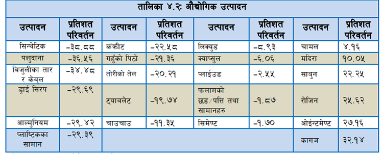 गत वर्ष सिन्थेटिक उत्पादन सबैभन्दा धेरै ३८.८८ प्रतिशतले घटेको छ । त्यसैगरी, पशुदाना ३६.५६ प्रतिशत, बिजुलीका तार र केबुल ३४.४८ प्रतिशत, ड्राइ सिरप २९.६९, आल्मुनियम २९.४२, प्लाष्टिकका सामान २९.३९ प्रतिश, कंक्रिट २२.५८ प्रतिशत, चाउचा ११.३५, फलामे डण्डी १.८७ प्रतिशत र सिमेन्ट उत्पादन १.७० प्रतिशतले घटेको छ ।