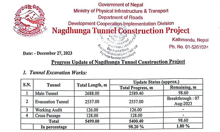 नागढुंगा-नौबिसे सुरुङमार्ग आयोजनाका अनुसार (पुस ११ गतेसम्म) कुल २६८८ मिटर मुख्य सुरुङमध्ये हालसम्म २५८९.४० मिटर खनिसकिएको छ । अब मुख्य सुरुङ ब्रेक थ्रु हुन ९८.६० मिटर मात्र बाँकी रहेको आयोजनाका सहायक निर्देशक गोविन्द डुमरूले जानकारी दिए ।