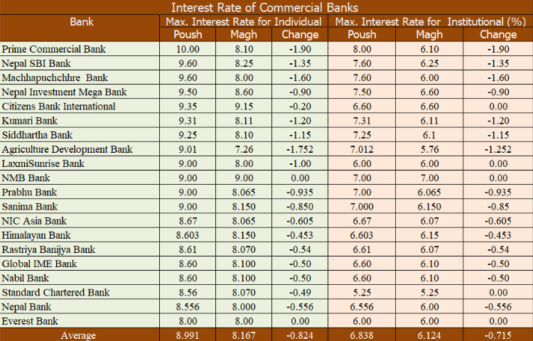 पुसको तुलनामा माघमा वाणिज्य बैंकहरूले औसतमा व्यक्तिगत निक्षेपतर्फ ०.८२४ प्रतिशत विन्दु र संस्थागततर्फ ०.७१५ प्रतिशत विन्दुले ब्याजदर घटाएका छन् । पुसमा व्यक्तिगत मुद्दतीको औसत ब्याजदर ८.९९१ प्रतिशत रहेकोमा माघमा घटेर ८.१६७ प्रतिशतमा झरेको छ । त्यस्तै, संस्थागत मुद्दतीको औसत ब्याजदर पुसमा ६.८३८ प्रतिशत रहेकोमा माघमा ६.१२४ प्रतिशतमा झरेको छ ।