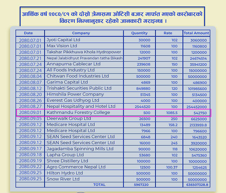 दोस्रो त्रैमासमा काठमाडौं फरेष्ट्री कलेजको सेयर प्रतिकित्ता १ हजार ८५.५ रुपैयाँ दरले किनबेच भएको छ । नेप्सेका अनुसार फरेष्ट्री कलेजको ५०० कित्ता सेयर ५ लाख ४२ हजार ७५० रुपैयाँँमा किनबेच भएको हो ।