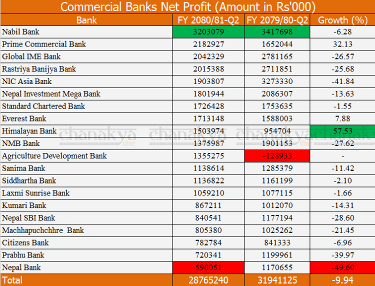 पुस मसान्तसम्म २० वटा वाणिज्य बैंकले कुल २८ अर्ब ७६ करोड ५२ लाख रुपैयाँ नाफा कमाएका छन् । यो गत वर्षको सोही अवधिको तुलनामा ३ अर्ब १८ करोड रुपैयाँ कम हो । बैंकहरूले गत वर्षको पुससम्म ३१ अर्ब ९४ करोड ११ लाख रुपैयाँ नाफा कमाएका थिए ।