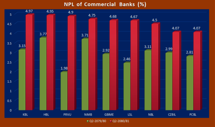 पुससम्म ९ बैंकको खराब कर्जा ४ प्रतिशत माथि रहेको छ । जसमा ३ बैंकको सीमा नजिक अर्थात् झन्डै ५ प्रतिशत पुगेको छ । यस अवधिमा कुमारी, हिमालयन, प्रभु, नेपाल इन्भेष्टमेन्ट मेगा, ग्लोबल आइएमई, लक्ष्मी सनराइज, नेपाल, सिटिजन्स र प्राइम कमर्शियलको खराब कर्जा ४ प्रतिशत माथि छ । जसमा कुमारीमा सबैभन्दा धेरै ४.९७ प्रतिशत छ ।