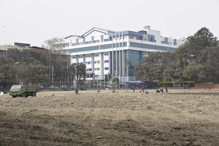 काठमाडौँ । खुला मञ्चमा प्राकृतिक दुबोसहितको घाँसे चउर बनाउन थालिएको छ । अहिले ग्रेडर लगाएर मैदानमा भएका ढुङ्गा टिप्न थालिएको छ ।
