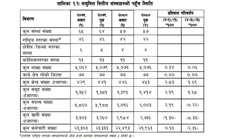 पुस मसान्तसम्म ५७ वटा लघुवित्त संचालनमा छन् तीमध्ये ३ वटा थोक कर्जा प्रदायक र ५४ वटा खुद्रा कर्जा प्रदायक छन् । समीक्षा अवधिमा थोक कर्जा प्रदायक लघुवित्त संस्थाहरूको वित्तीय स्रोत संकलन (निक्षेप संकलन र सापटी)मा गिरावट आएको छ । लघुवित्तहरू नयाँ व्यवसाय विस्तारमाभन्दा कर्जा असुलीमा केन्द्रित हुँदा स्रोत संकलन गरेका हुन् ।