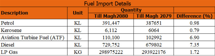 त्यस्तै, हवाई इन्धनको आयात ६.९० प्रतिशतले बढेको छ । चालु आवको माघसम्म गत वर्षको सोही अवधिको तुलनामा ७ हजार १०८ किलोलिटर बढी अर्थात् १ लाख १० हजार १०० किलोलिटोर हवाई इन्धन आयात भएको छ ।