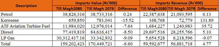 चालु वर्षमा डिजेल आयातबाट सबैभन्दा धेरै २८ अर्ब २५ करोड, पेट्रोलबाट २१ अर्ब ९ करोड, हवाई इन्धनबाट १ अर्ब २४ करोड र खाना पकाउने एलपी ग्यासबाट ६ अर्ब २१ करोड राजस्व असुली गरेको छ ।
