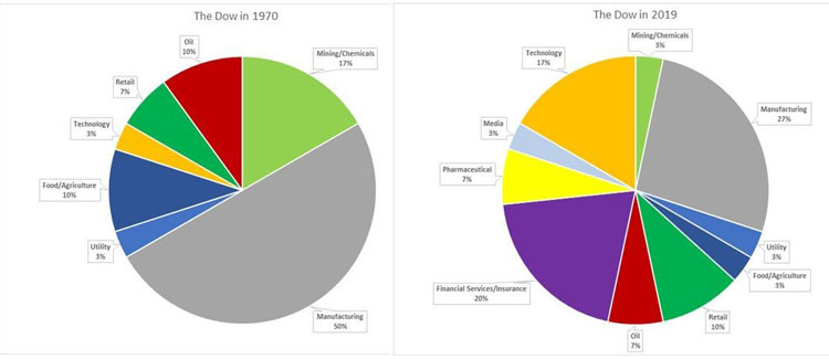 सन् १९७० मा अमेरिकाको ठूला ३० कम्पनीहरुमा कोडाक मात्र एउटा प्रविधिजन्य कम्पनी थियो । अहिलेको अवस्था तलका चार्टहरुमा देखाइएको छ ।