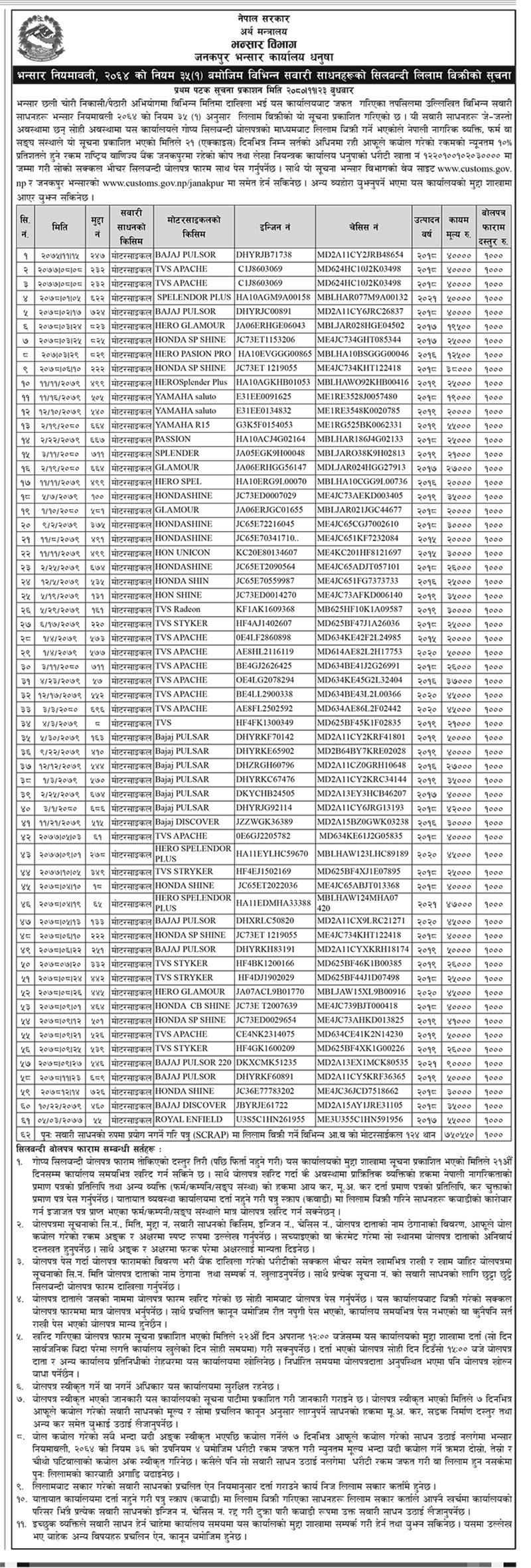 काठमाडौं । जनकपुर भन्सार कार्यालयले १८५ यूनिट मोटरसाइकल लिलामीमार्फत बिक्री गर्ने भएको छ ।