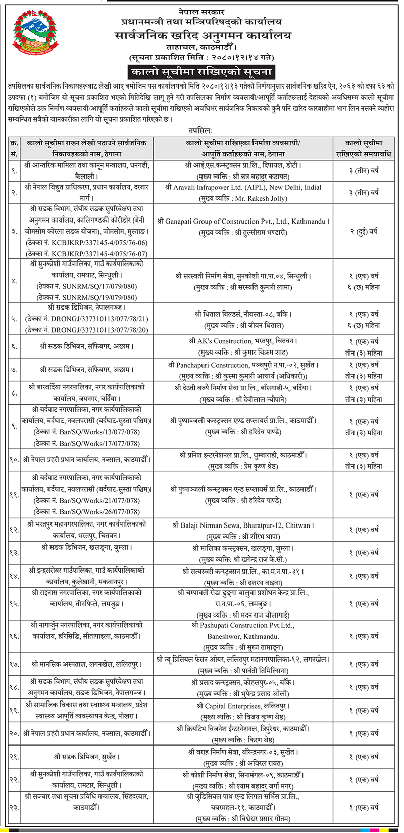 कालिगण्डकी कोरिडोर (बेनी जोमसोम कोरला सडक) आयोजनाको सिफारिसमा गणपति ग्रुप अफ कन्स्ट्रक्शन, काठमाडौंलाई २ वर्ष, सुनकोशी गाउँपालिकाको सिफारसमा सरस्वती निर्माण सेवा, सिन्धुली र सडक डिभिजन नेपालगञ्जको सिफारिसमा धिताल बिल्डर्स, नौबस्तालाई डेढ वर्षका लागि कालोसूचीमा राखेको छ ।