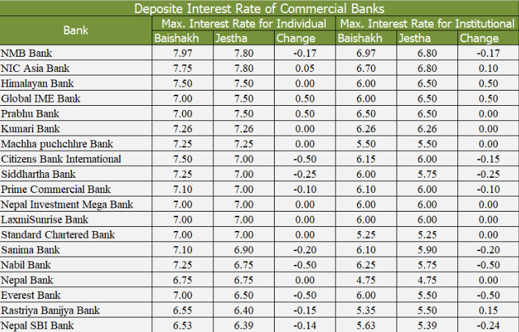 वैशाखको तुलनामा जेठमा वाणिज्य बैंकहरूले औसतमा व्यक्तिगत निक्षेपतर्फ ०.०७ प्रतिशत बिन्दु र संस्थागततर्फ ०.०४ प्रतिशत बिन्दुले घटाएका छन् । वैशाखमा व्यक्तिगत मुद्दतीको औसत ब्याजदर ७.०७ प्रतिशत रहेकोमा जेठमा घटेर ७ प्रतिशतमा झरेको छ । त्यस्तै, संस्थागत मुद्दतीको औसत ब्याजदर वैशाखमा ५.८७ प्रतिशत रहेकोमा जेठमा ५.८३ प्रतिशतमा झरेको छ ।