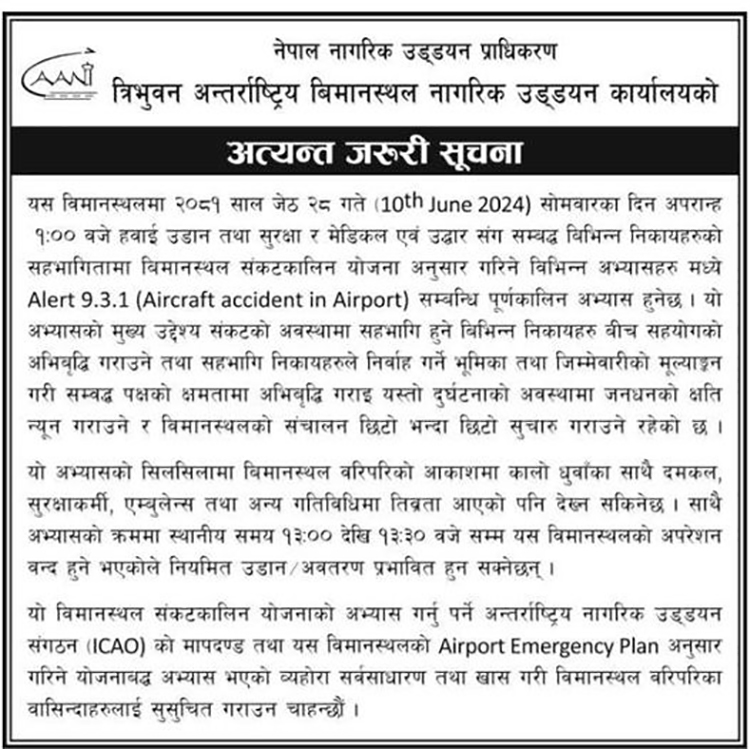 यो अभ्यासको सिलसिलामा विमानस्थल वरिपरीको आकाशमा कालो धुवाँका साथै दमकल, सुरक्षाकर्मी, एम्बुलेन्स तथा अन्य गतिविधिमा तीव्रता आएको देख्न सकिनेछ ।