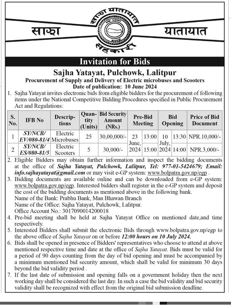 इच्छुक बिक्रेताले एक महिना (असार २६ गते) भित्र साझा यातायातको कार्यालयमा आवेदन दिनुपर्नेछ । माइक्रोबसको लागि टेन्डर हाल्नेले ३० लाख र स्कुटरका लागि ३० हजार रुपैयाँ धरौटी राख्नुपर्ने साझाले जनाएको छ ।