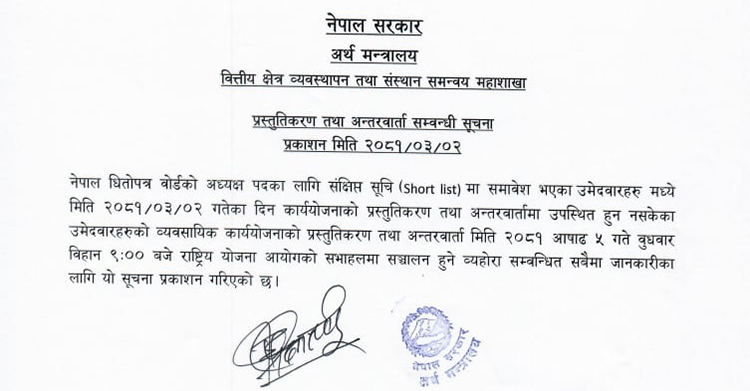 काठमाडौं । नेपाल धितोपत्र बोर्डको अध्यक्ष छनोटका लागि अब असार ५ गते अन्तर्वार्ता तथा प्रिजेनटेसन हुने भएको छ ।