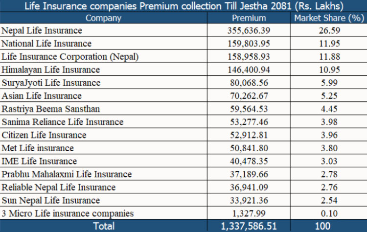 नेपाल बीमा प्राधिकरणको तथ्यांक अनुसार जेठ मसान्तसम्म जीवन बीमा व्यवसाय गर्ने १७ कम्पनीले कुल १ खर्ब ३३ अर्ब ७५ करोड रुपैयाँ बीमा शुल्क संकलन गरेका हुन् । जसमा १४ जीवन बीमा कम्पनीले १ खर्ब ३३ अर्ब ६२ करोड र ३ लघु जीवन बीमा कम्पनीले १३ करोड २७ लाख रुपैयाँ बीमा शुल्क संकलन गरेका छन् ।