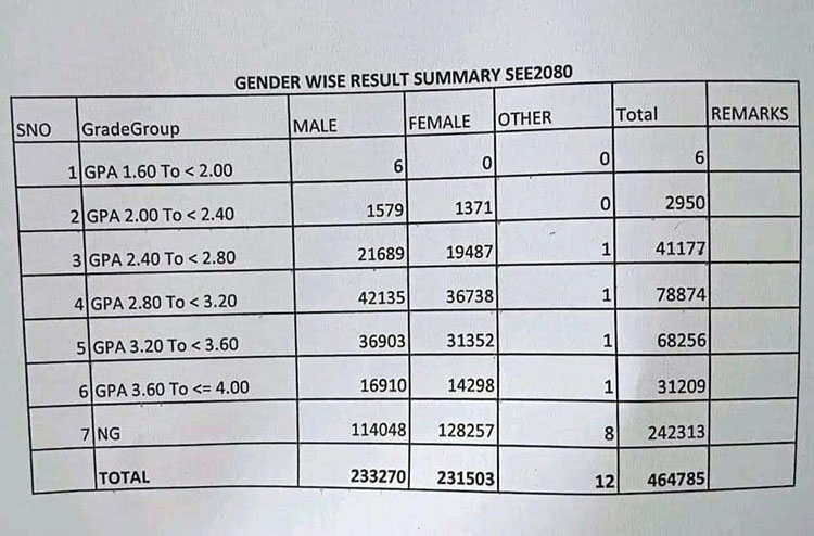 परीक्षामा सहभागी भएकामध्ये ५२.१४ प्रतिशत अर्थात् २ लाख २२ हजार ६९३ परीक्षार्थीले ननग्रेड (एनजी) ल्याएका छन् । उनीहरुले पुनः ग्रेड वृद्धि परीक्षामा सहभागी हुनुपर्नेछ । २२१ जनाको परीक्षा रद्द भएको उनले जानकारी दिए।