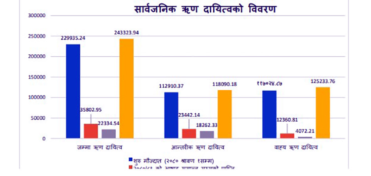 गत वर्ष सरकारले २ खर्ब २३ अर्ब रुपैयाँ साँवा र ८२ अर्ब रुपैयाँ ब्याज तिरेको छ । जसमा आन्तरिकतर्फ १ खर्ब ८२ अर्ब साँवा र ७२ अर्ब ७६ करोड ब्याज तिरेको छ । त्यस्तै, बाह्यतर्फ ४० अर्ब साँवा र ९ अर्ब २९ करोड रुपैयाँ ब्याज तिरेको छ ।