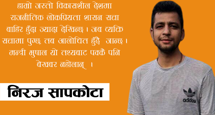 हाम्रो जस्तो विकासशील मुलुकमा राजनीतिक लोकप्रियता शासन सत्ता बाहिर ज्यादा देखिन्छ । जब व्यक्ति शासन पद्धतीको हिस्सेदार बन्न पुग्छ तब ऊ केही आलोचित हुन थाल्छ । कमजोर योजना तथा फितलो कार्यान्वयन प्रणाली त्यसका कारण हुनसक्छन् ।